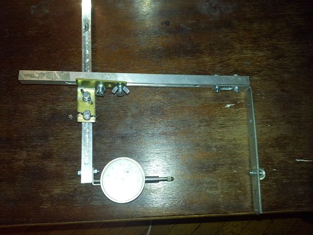 Собственно вот мой рукотворный шедевр для измерения биения дисков и ступицы. Крепил к амортизатору строительными хомутами с винтом-барашком.