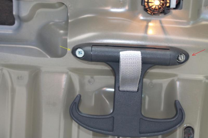 Для крепления крюка в существующем отверстии, вставляем винт, а гайку изнутри придерживаем пальцами. Закрепив крюк намечаем место под второе отверстие (обозначено красной стрелкой).