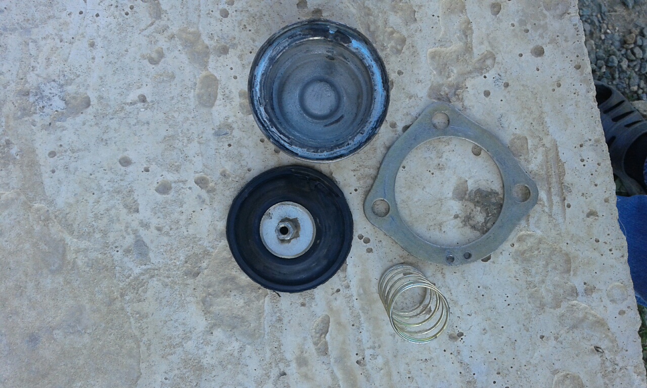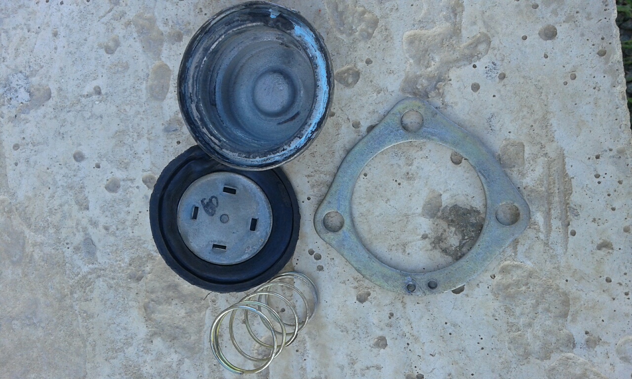 Мож кому пригодится.Короче накрылся вакумник,точнее мембрана.Полазил по форумам нашел кое-что,попробовал -ну на неделю,на две хватало и опять дерганье,расход ит.д.Клеить перчатки или презики надоело.Купил Вазовскую мембрану от ускорительного клапана ,снял с неё тягу,вместо неё ставим тойотовскую заранее отрезав ее и прогнав на неё резьбу.Одну половину развальцованного корпуса мембраны стачиваем по плоскости,чтобы плотнее прижать к другой половине.Соединяем крышки,чтобы не двигались,и сверлим четыре отверстия под болтики,ближе к наружнему диаметру.Ставим на место новую мембрану,прмазав края герметиком,не забываем пружину,и стягиваем болтиками.Ставим механизм на место и наслаждаемся.