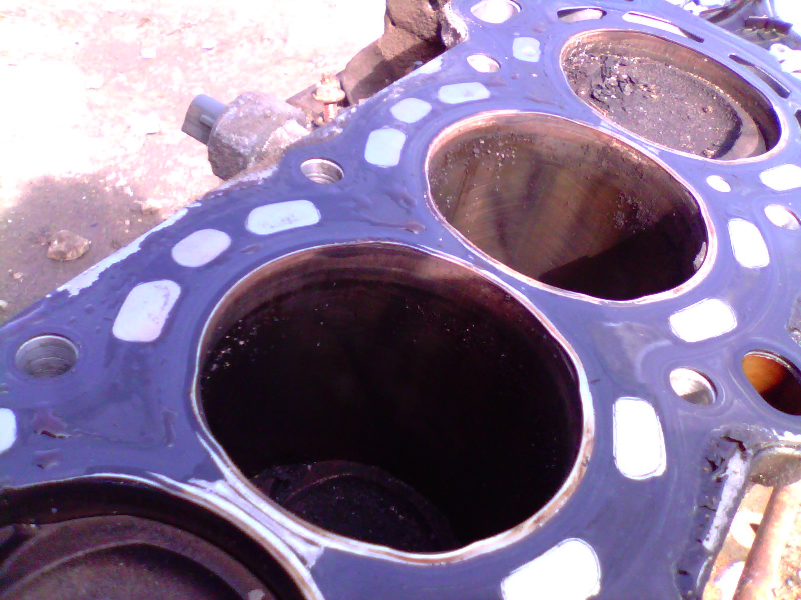 Измерения показали износ до 10 соток - много, но терпимо. Допустимый зазор поршень-цилиндр - 15 соток. Самый изношеный цилиндр - 1-ый. Это и понятно: масло и антифриз поступают со стороны 4-го цилиндра, т.ч. первый - "самый жаркий".