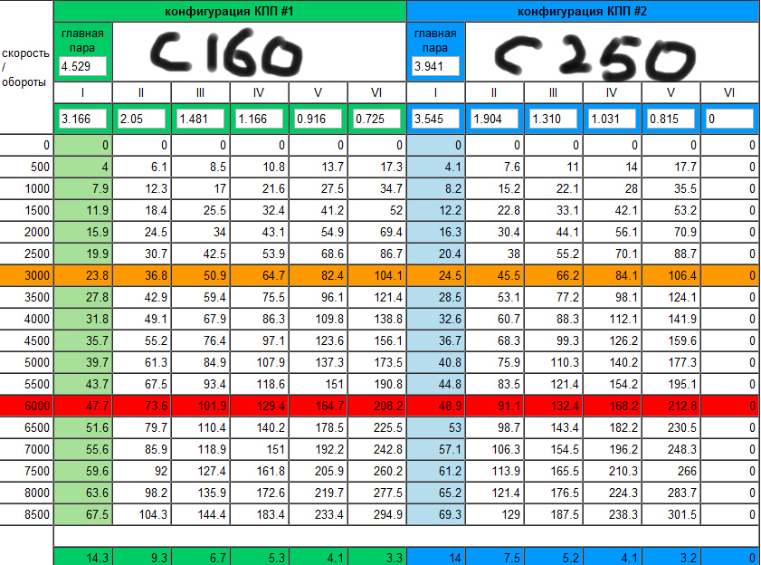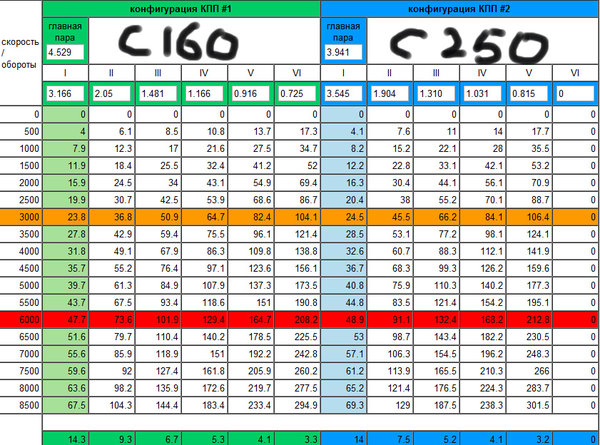 Говорят разницы в драге между с56 и с160 никакой, т.к. с56 ГП 4.3 5КПП, а с160 рвущей ГП 4.5 но 6КПП будет проигрывать на переключениях. И выходит с56=160. НО! с160 будет лучше для трассы и это видно из табличек.