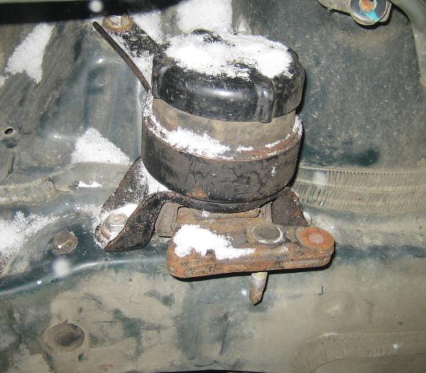 Вварной гайки не было под левым нижним болтом подушки (см. фото выше). Рядом с ним виден болт поменьше - это как раз тот самый болт, который крепит хвост "вварной гайки". Все держится крепко и, как показал опыт, за полгода нахождения в сырых условиях, изготовленная конструкция благодаря обработке кислотой даже не собралась ржаветь. Так была решена первая проблема.