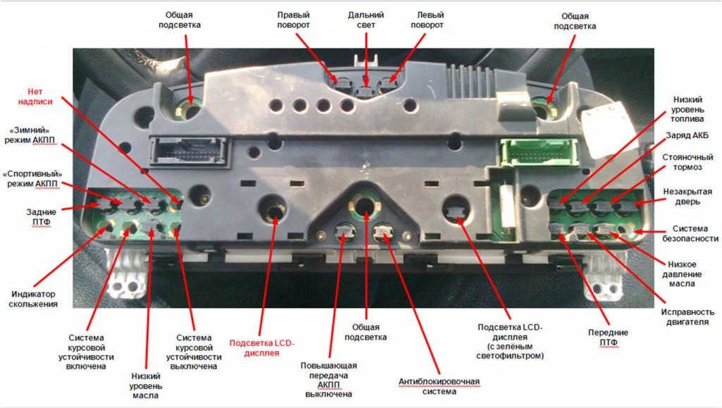 там явно кто то частично вытащил!!! вверху по центру нет лампы дальнего света, В правом углу на сколь помню подушки безопасности лампа стоит, по центру внизу лампа овердрайв, вторую не помню, в левом углу две лампы режимов коробке ектив повер и ектив сноу, ещё одна уровень масла (желтая масленка) остальные не помню...
