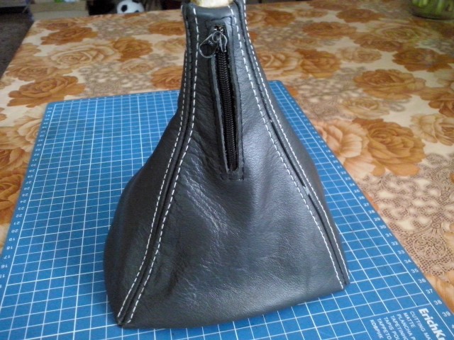 По набалдашнику могу предложить следующий вариант: должен где-то у меня остаться хороший эластичный черный кожзам. Тянется очень хорошо, шарик набалдашника обтягивает как родной. Попробую сделать выкройки по своему рычагу, отстрочить детали и приложить нитки для сшивания. Останется ровно подклеить детали на набалдашник и сшить на нем детали по месту. Шов как на фото шьется очень легко, просто иголкой заплетаются машинные стежки швов по краям деталей.